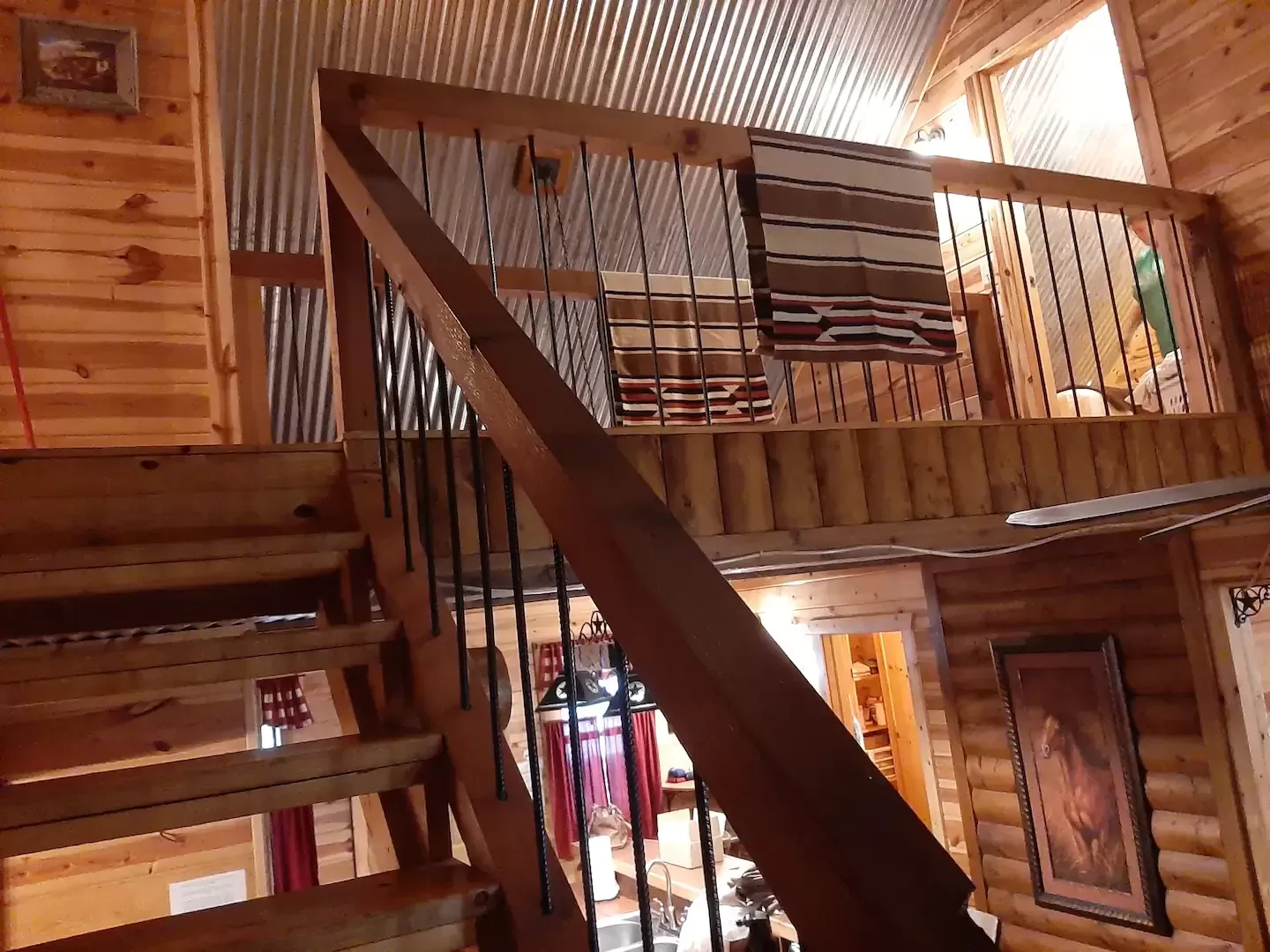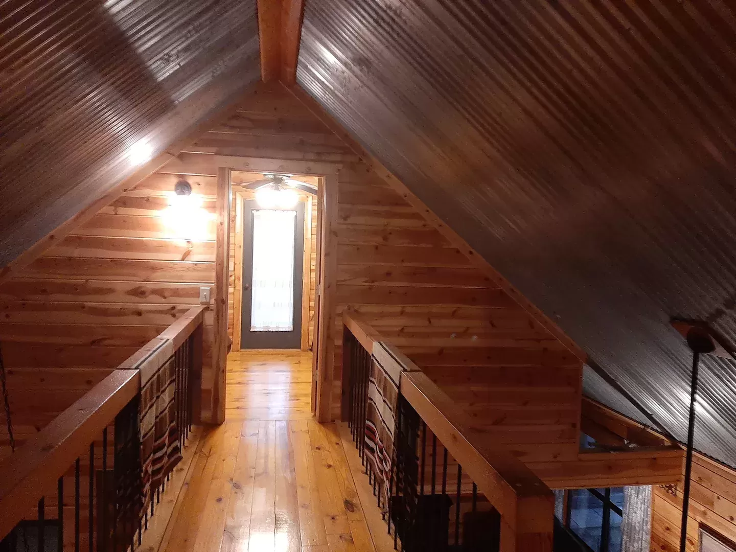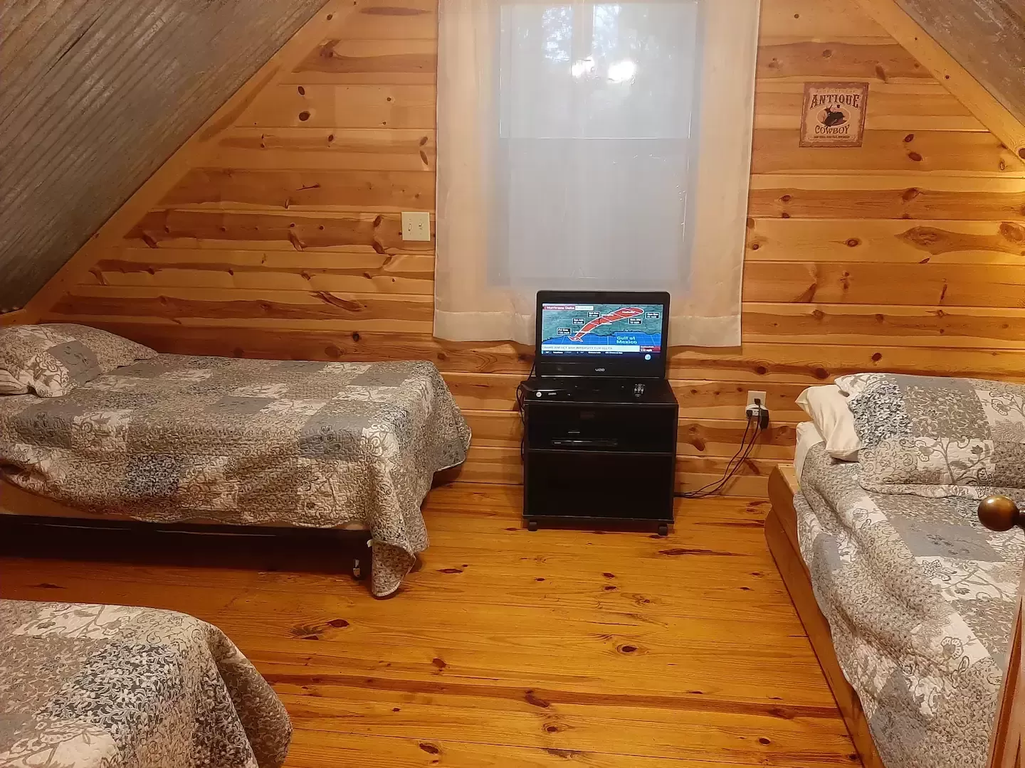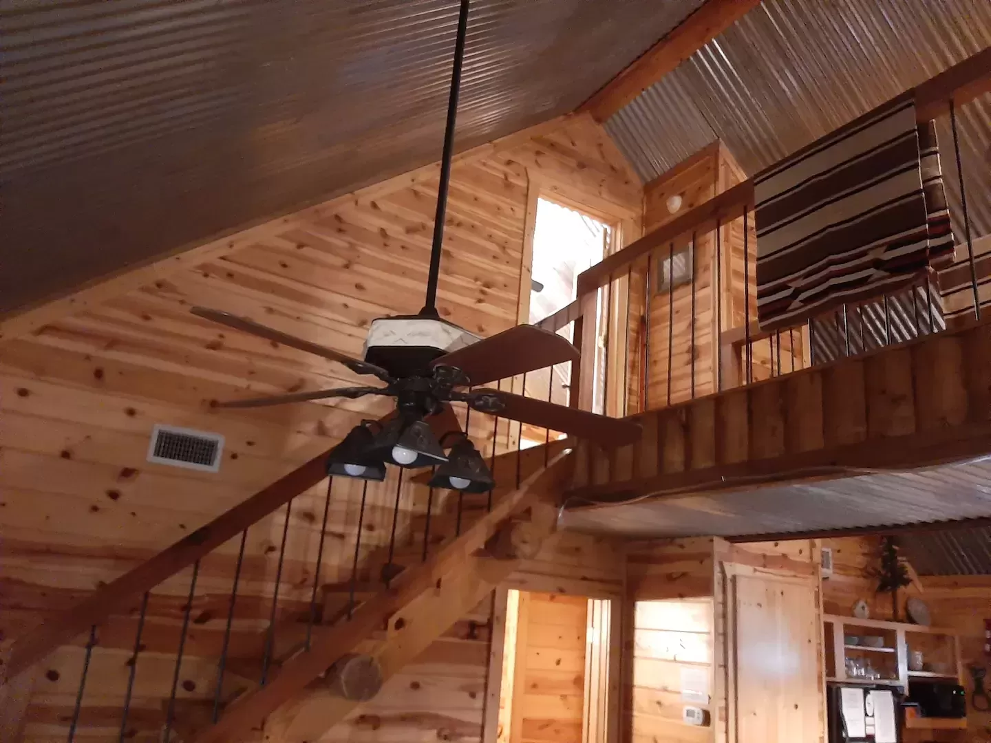 Upstairs has two bedrooms with a catwalk in between them that looks down into the kitchen, dining area & living area. One upstairs bedroom has a king bed, 32″ Smart TV with a Roku attachment & a small covered balcony. The other upstairs bedroom has 2 twin beds & 1 full bed with a small Smart TV/DVD.