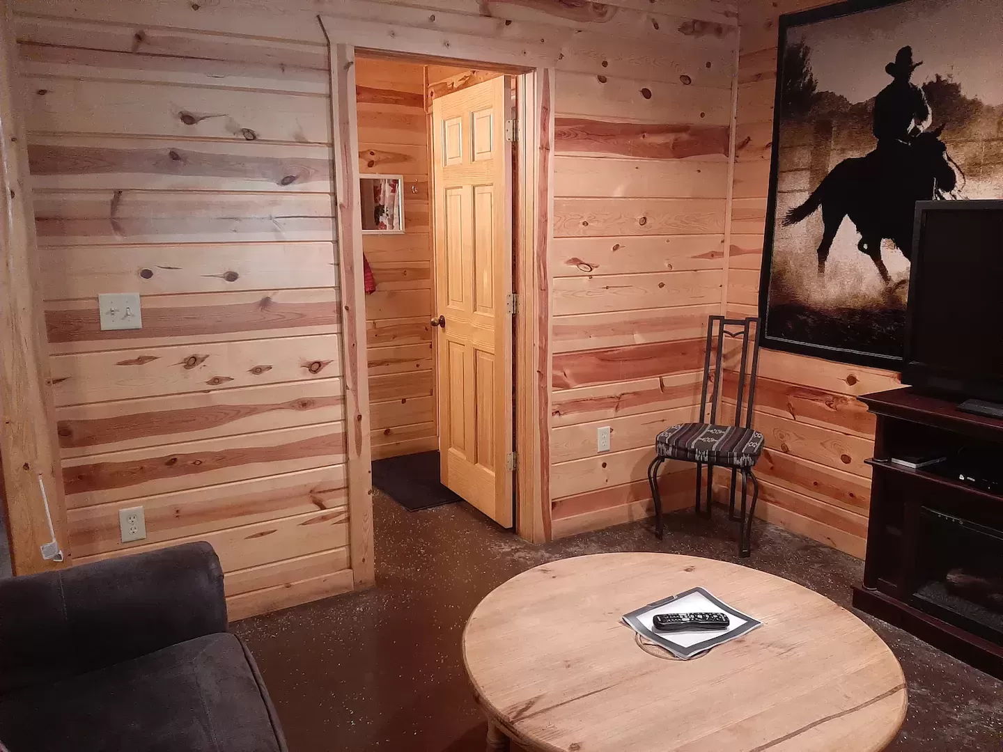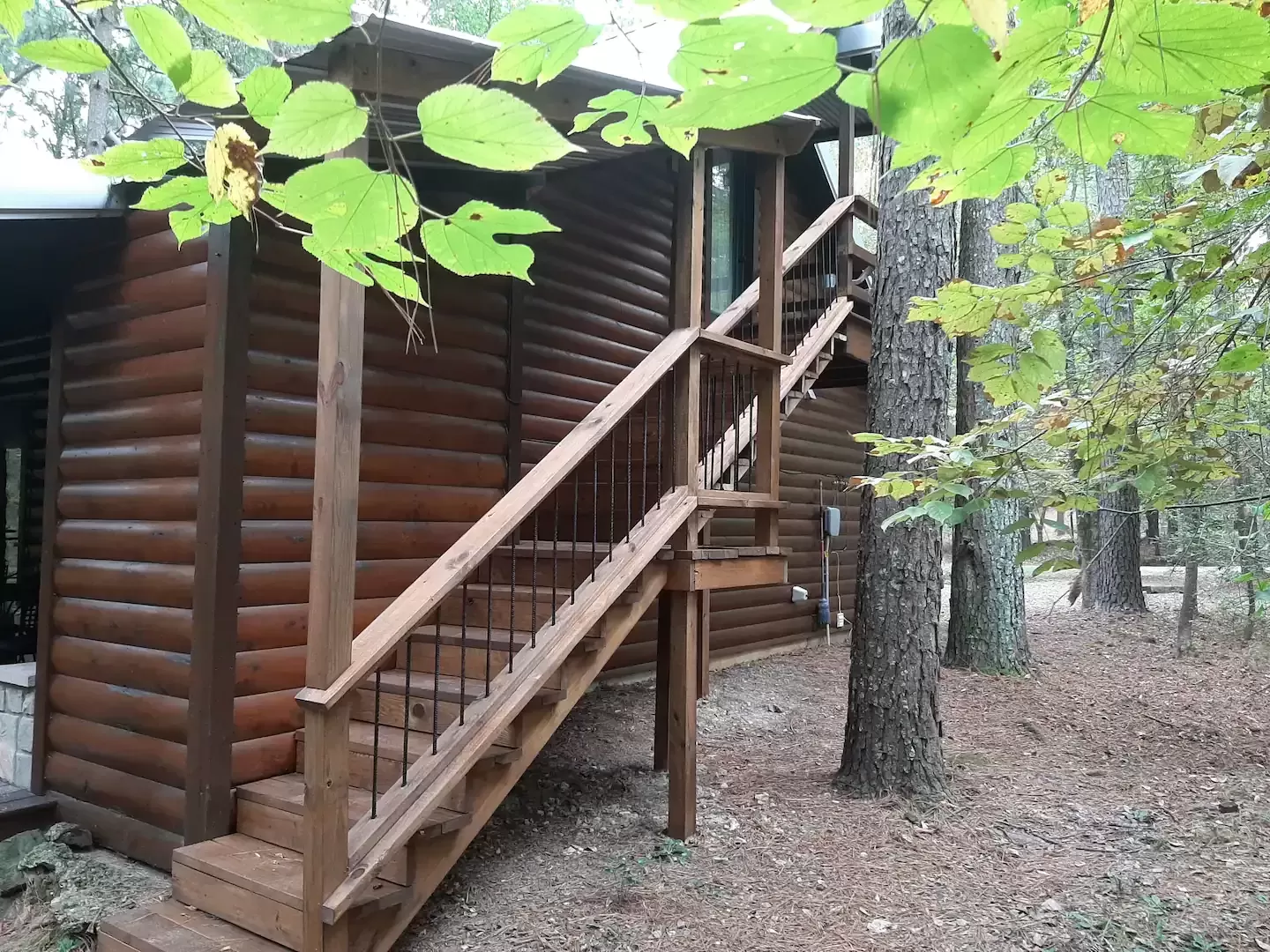 - Concrete front porch across front of cabin w/ log seating