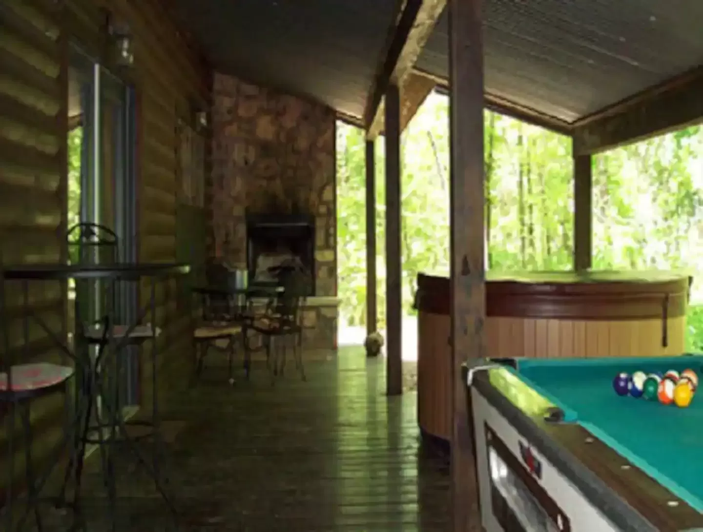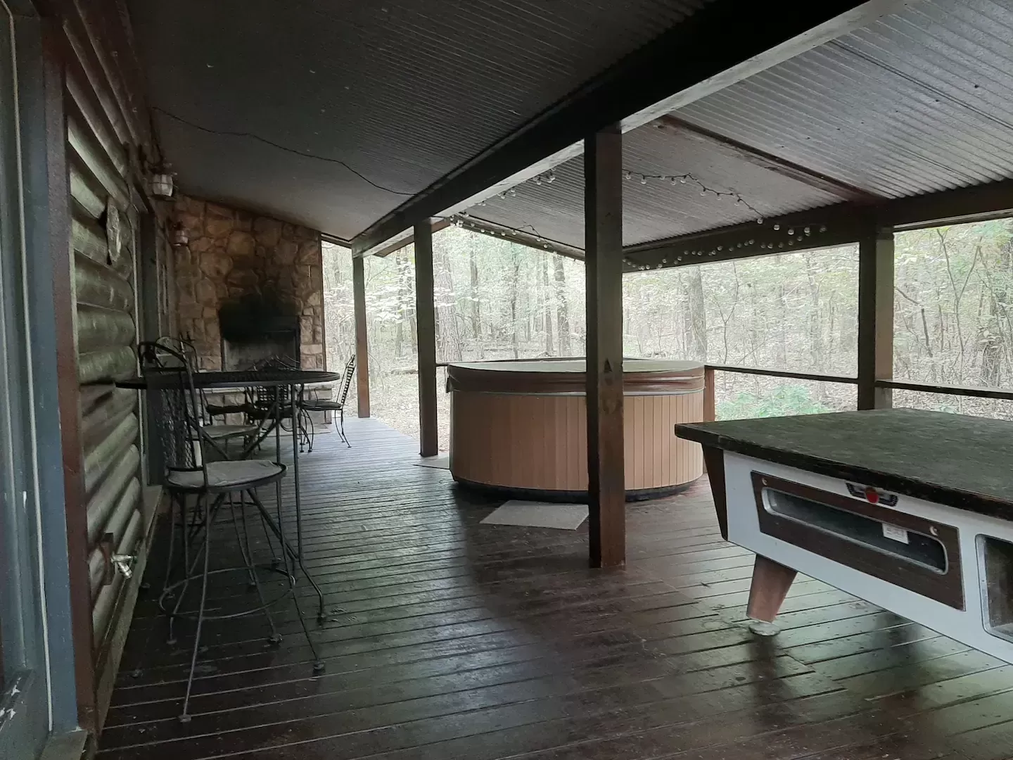 Additional extras include- the 380 sq ft back covered patio deck with an outdoor wood burning fireplace, 5-6 person hot tub, pool table & patio furniture. The cover to the pool table serves also as a ping pong table.To the side of the cabin there is a camp fire pit with patio chairs to sit around & star gaze.