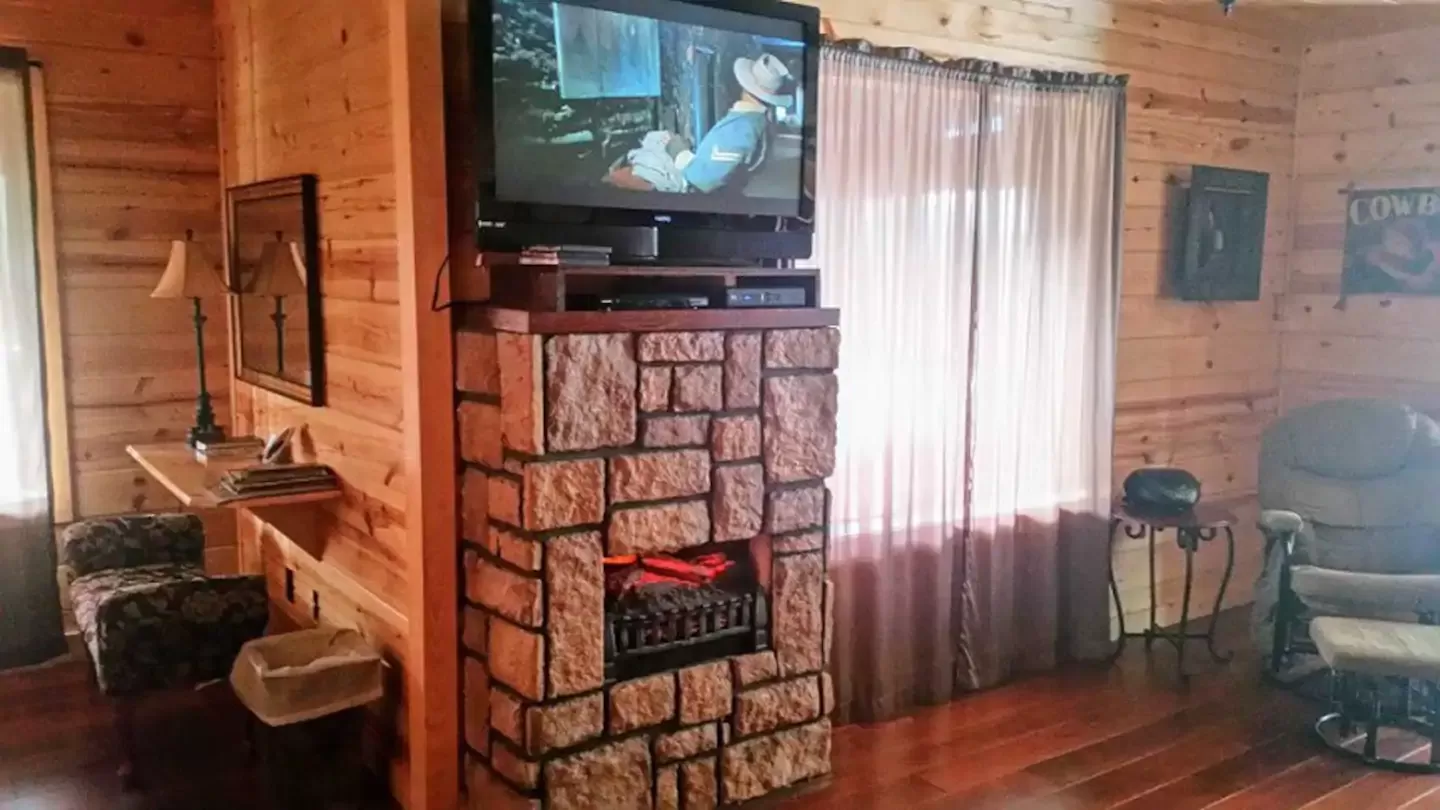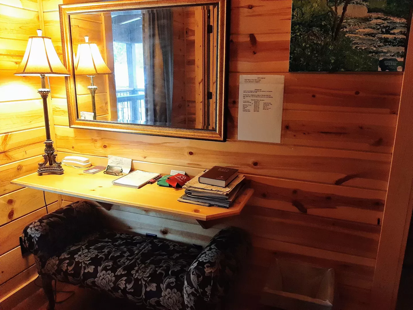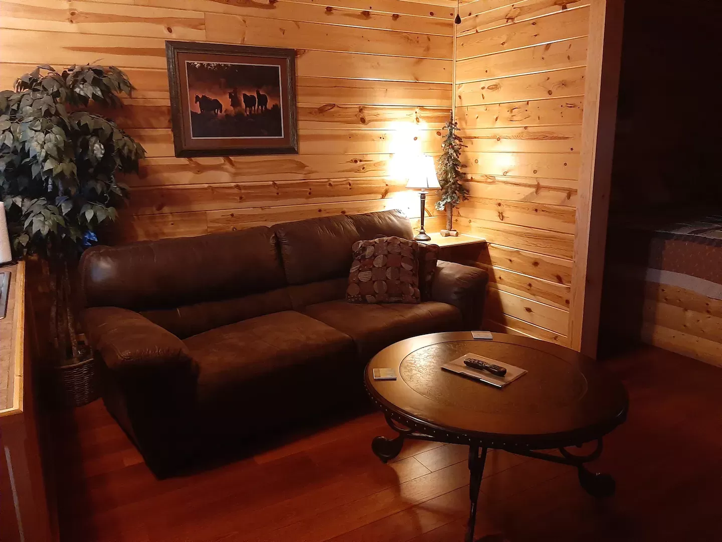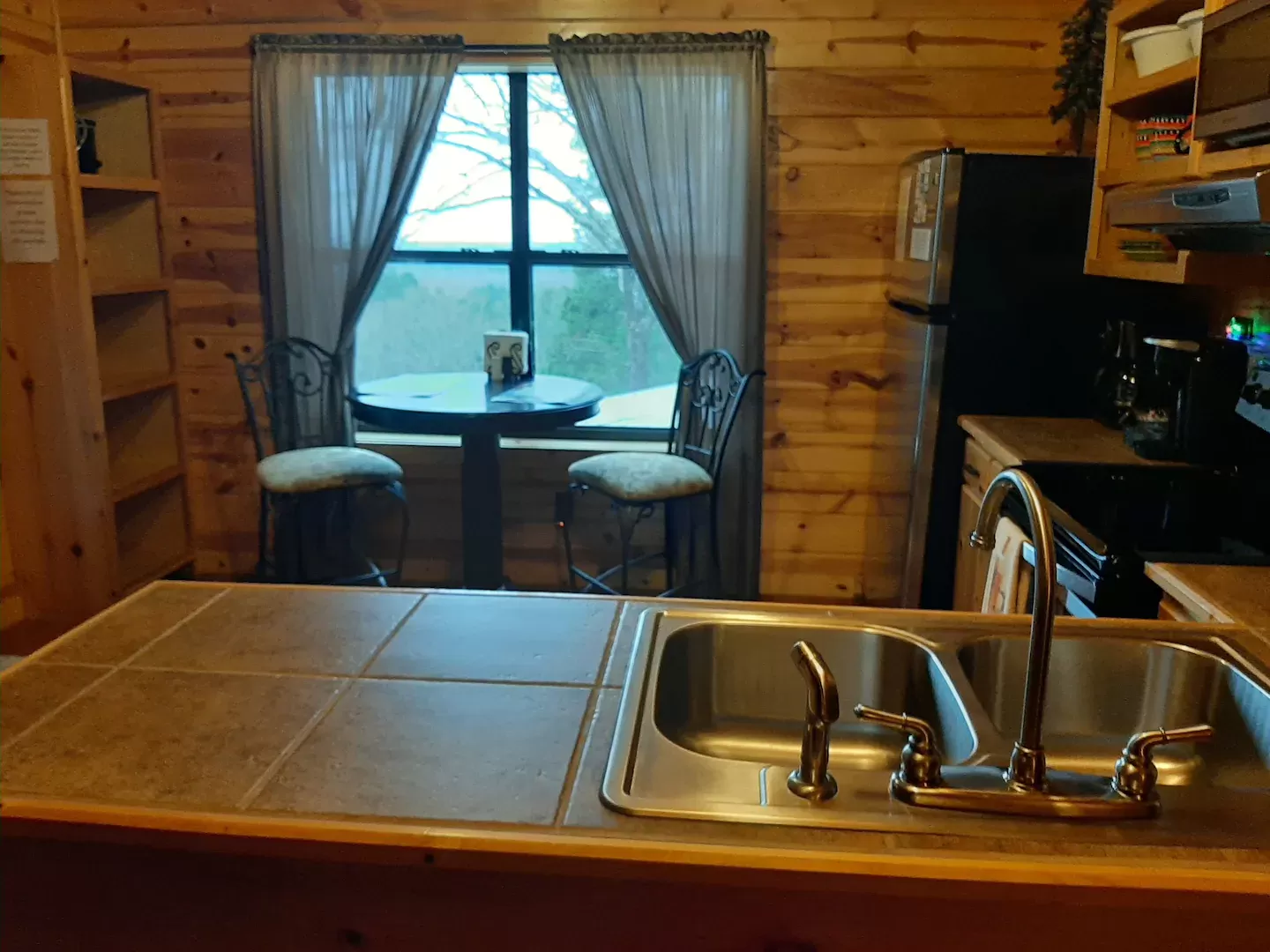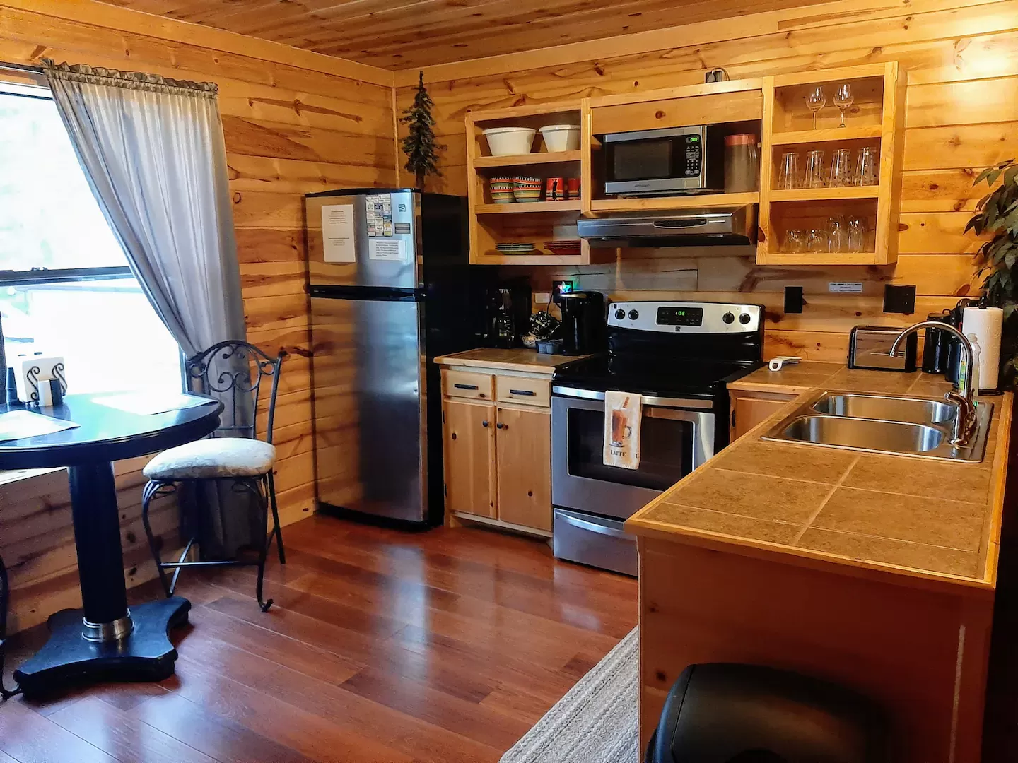 This 872 square foot suite is ideal for one or two adults. Evening Star includes a full-size kitchen, a flat screen 42″ TV with a Roku adapter, a DVD, WIFI, electric log fireplace, and rustic decor. The kitchen has all the amenities with a refrigerator w/ ice maker, electric range/oven, microwave, and dishwasher. There is also a Mr. Coffee coffee maker, a Keurig coffee maker, toaster, blender & crockpot. On the outside deck is a bistro table for two with a breathtaking view.