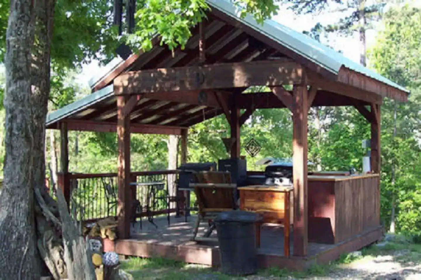 Outdoors includes more than 200 square feet of upstairs covered deck, with a panoramic 50 mile view from the hot tub with a patio table & 2 chairs. There is a nearby outdoor kitchen across the drive that has a gas grill, charcoal grill, a sink with running cold water & a table with 2 chairs. The outdoor kitchen is a great place to clean fish. Next to the outdoor kitchen is a campfire pit & patio chairs.