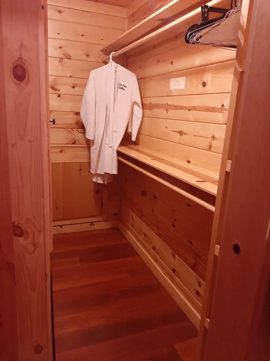 The bedroom area has a king-size bed on a log pedestal, along with a window seat in which to relax and read. A full-size bathroom is included with a four-foot shower. The vanity area, outside the bathroom, can double as a vanity or desktop area in which to use the complimentary WIFI internet. The network & password is emailed before arrival. This suite is complete with double-rod and built-in shelves in the walk-in closet.