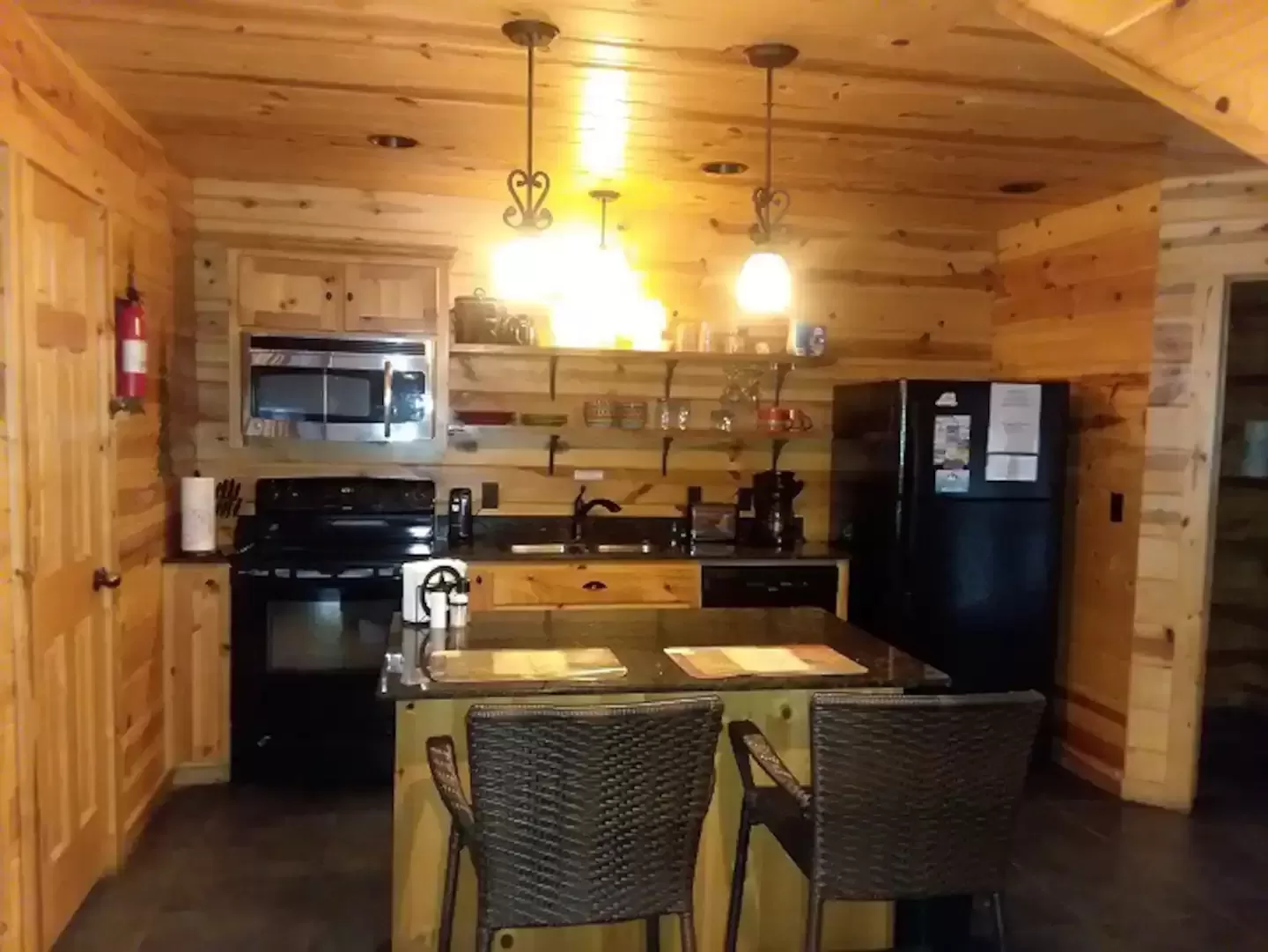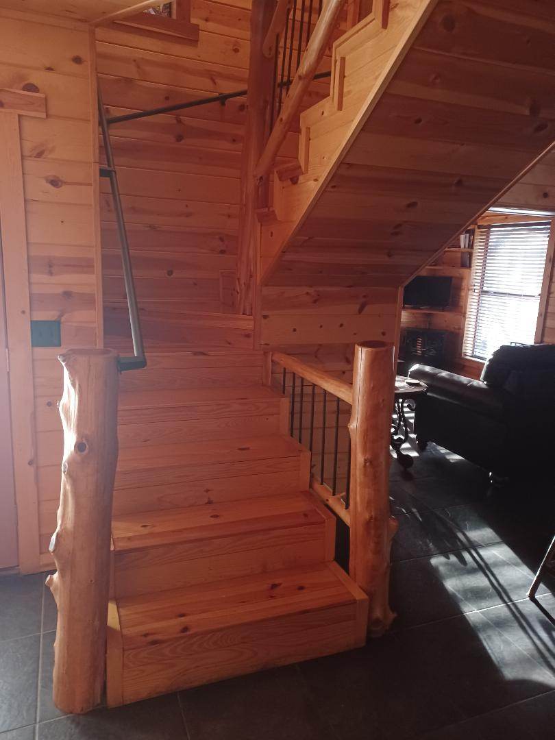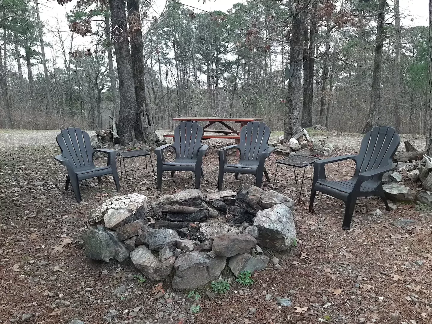 Upstairs includes a king master bedroom with a 36″ Smart TV with a Roku adapter, & a DVD player, a coffee bar (including a drip coffee maker, Keurig coffee maker, small fridge, sink, & granite counter tops) & an electric log stove. Walk out to the small covered bedroom balcony and gaze at the Kiamichi Mountains in the National Forest w/ the boundary only 10 ft from the cabin. Also upstairs you will find a large walk-in closet, and full bath with a shower/tub combination, sink with granite counter tops and separate vanity.