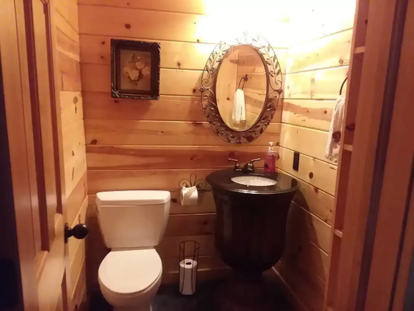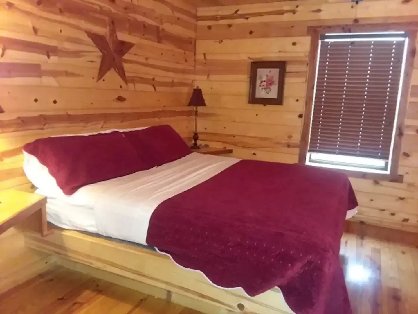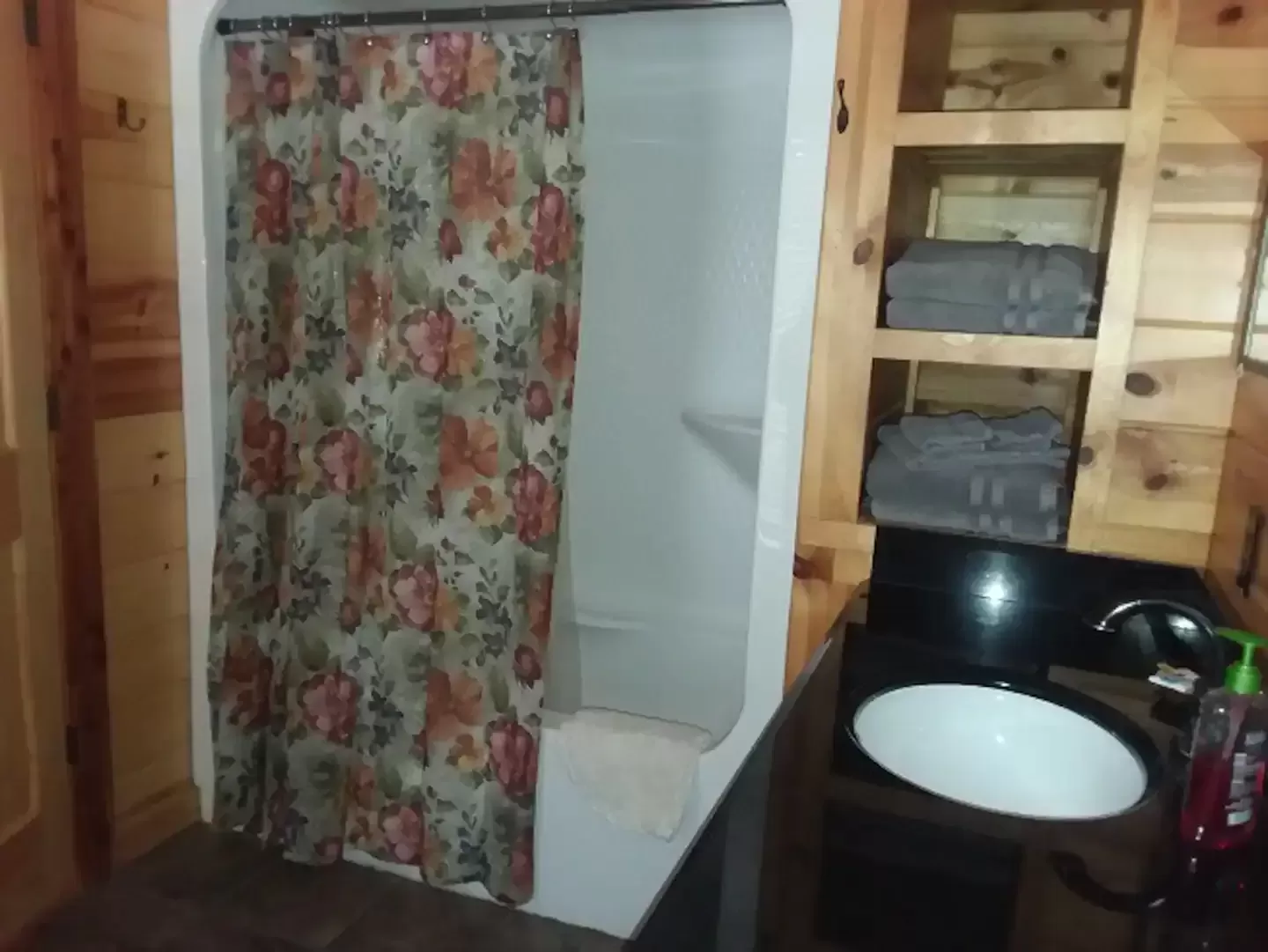 Upstairs includes a king master bedroom with a 36″ Smart TV with a Roku adapter, & a DVD player, a coffee bar (including a drip coffee maker, Keurig coffee maker, small fridge, sink, & granite counter tops) & an electric log stove. Walk out to the small covered bedroom balcony and gaze at the Kiamichi Mountains in the National Forest w/ the boundary only 10 ft from the cabin. Also upstairs you will find a large walk-in closet, and full bath with a shower/tub combination, sink with granite counter tops and separate vanity.