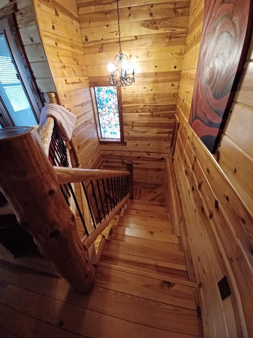 This 876 sq. ft. cabin guest house is perfect for one or two adults. The guest house has an attached roof line that is on the far east end of the lodge. The downstairs includes a living area, a 36″ Smart TV with a Roku adapter, electric log stove, roll-top desk, leather furniture, wooden blinds and French doors. The kitchen has all the amenities, including a full size fridge w/ ice maker, range/oven, microwave, dishwasher, granite countertops. Plus there is a 10 cup drip coffee maker, Keurig coffee maker, toaster, blender & crock pot. There is also a large walk in pantry & a half bath downstairs.