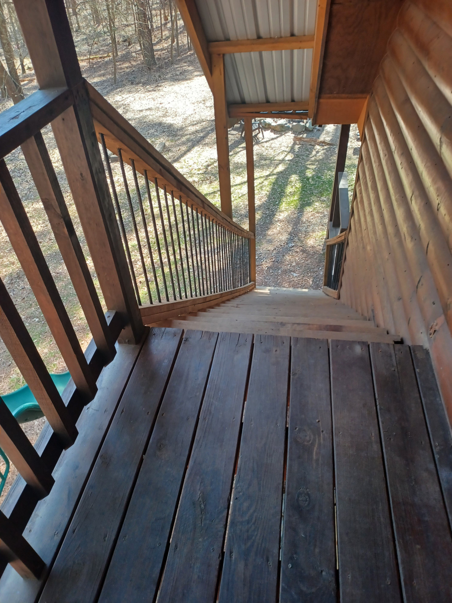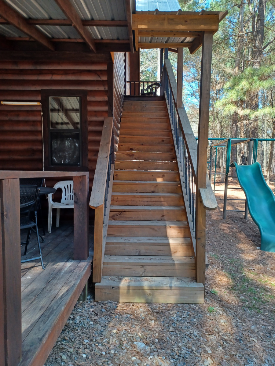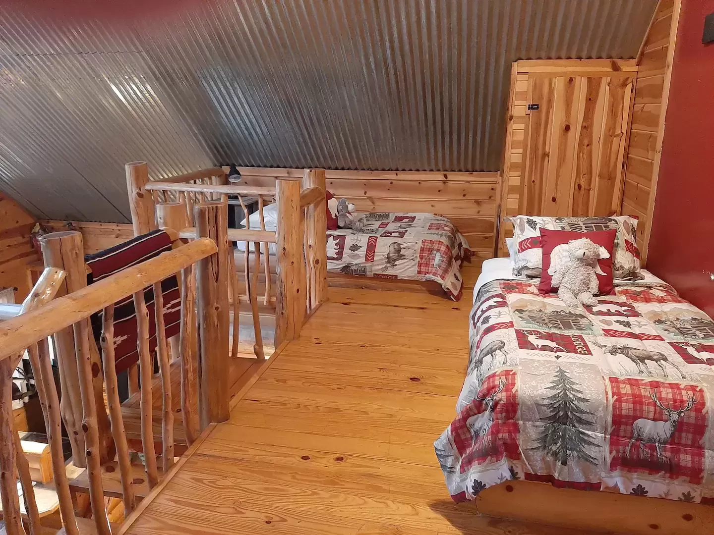 The upstairs loft bedroom features a king bed & an additional separate area with two single beds, a full bath Plus there is a small upstairs outside balcony with outside stairs. This is a safety feature.