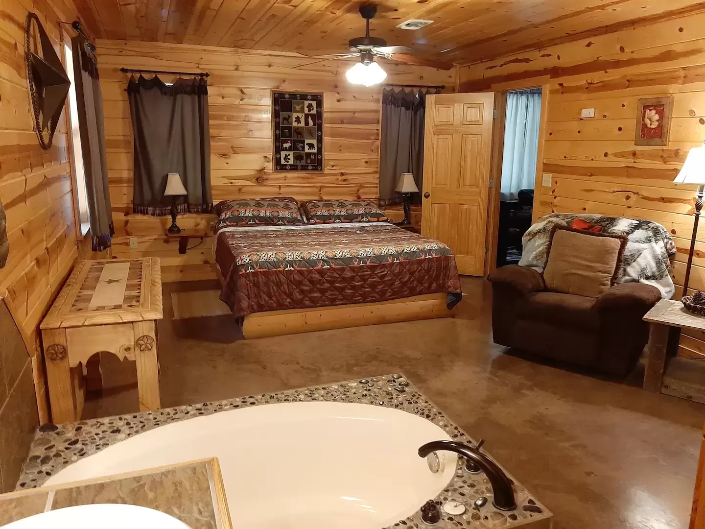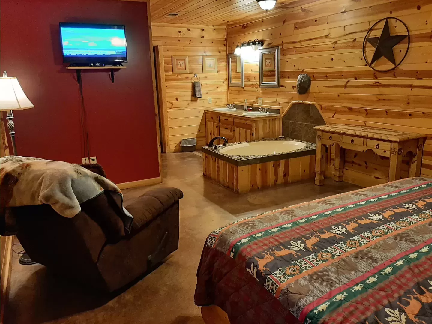 This cabin features a first floor large master bedroom with a king bed, garden tub & double bathroom sinks, sitting area with recliner, 32″ Smart TV with a Roku attachment & DVD player. There is also a walk-in closet & private master bath with a large shower